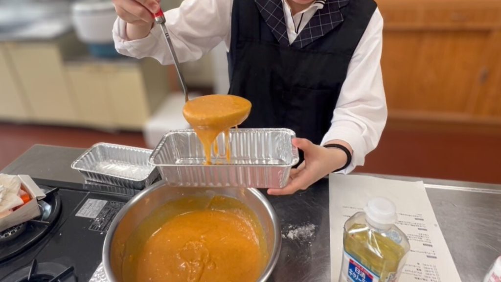 調理ゼミでは、栄養のあるおやつをテーマにレシピを考え、人参をすりおろして「キャロットケーキ」を作りました。
